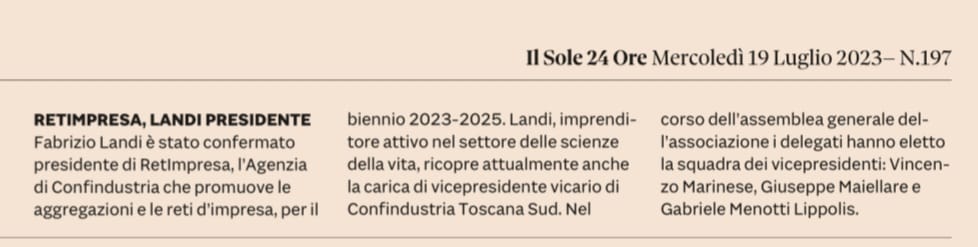 Martedì 18 luglio 2023 l’Assemblea dei Soci di RetImpresa ha confermato Fabrizio Landi Presidente per il biennio 2023-2025, e ha eletto la nuova squadra dei Vice Presidenti, composta da Gabriele Menotti Lippolis, Giuseppe Maiellare e Vincenzo Marinese.