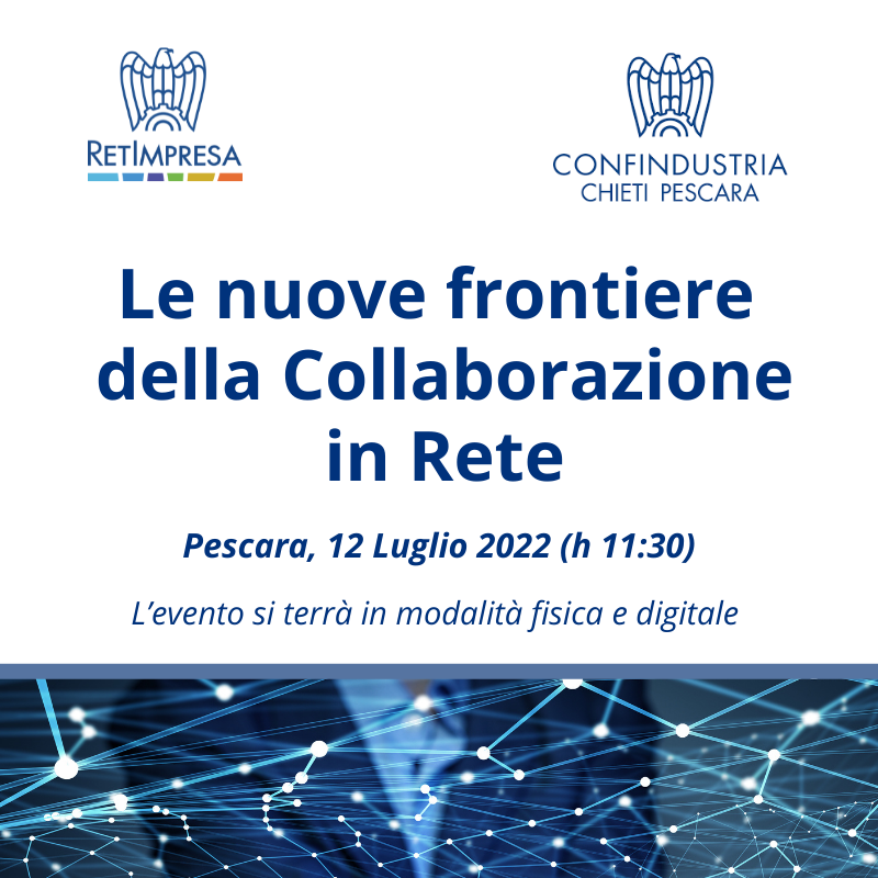 Si terrà il 12 luglio 2022 alle ore 11:30, presso la sede di Confindustria Chieti Pescara, l’evento “Le nuove frontiere della Collaborazione in Rete” organizzato da RetImpresa e Confindustria Chieti Pescara.