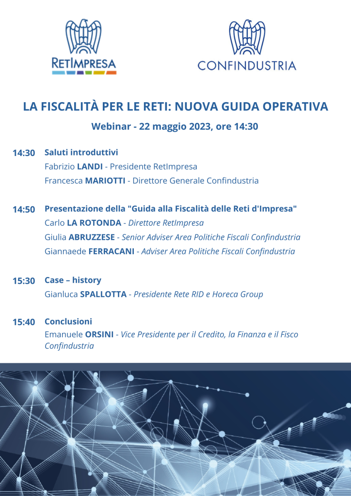 Al webinar interverranno il Direttore Generale di Confindustria Francesca Mariotti, il Vice Presidente per il Credito, la Finanza e il Fisco di Confindustria Emanuele Orsini, il Presidente di RetImpresa Fabrizio Landi ed esperti della tematica fiscale e delle reti.