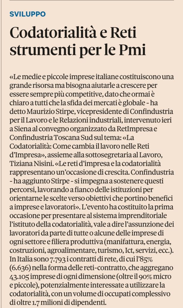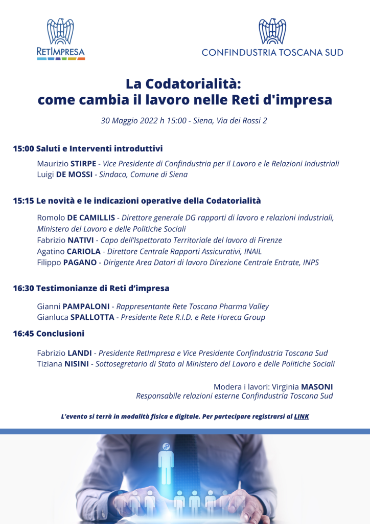 Si è tenuto il 30 maggio 2022, alle ore 15:00, a Siena (Via dei Rossi, 2) il Convegno “La Codatorialità: come cambia il lavoro nelle Reti d’impresa”, organizzato in collaborazione con Confindustria Toscana Sud, con la partecipazione del Vice Presidente di Confindustria per il Lavoro e le Relazioni Industriali, Maurizio Stirpe, del Sottosegretario al Ministero del Lavoro e delle Politiche Sociali, Sen. Tiziana Nisini, del Sindaco di Siena, Luigi De Mossi, del Presidente di RetImpresa e Vice Presidente di Confindustria Toscana Sud, Fabrizio Landi, e dei rappresentanti del Ministero del Lavoro e degli altri Enti competenti sulla materia (Inps, Inail, INL).