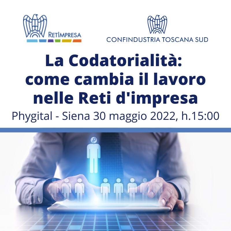 Si è tenuto il 30 maggio 2022, alle ore 15:00, a Siena (Via dei Rossi, 2) il Convegno “La Codatorialità: come cambia il lavoro nelle Reti d’impresa”, organizzato in collaborazione con Confindustria Toscana Sud, con la partecipazione del Vice Presidente di Confindustria per il Lavoro e le Relazioni Industriali, Maurizio Stirpe, del Sottosegretario al Ministero del Lavoro e delle Politiche Sociali, Sen. Tiziana Nisini, del Sindaco di Siena, Luigi De Mossi, del Presidente di RetImpresa e Vice Presidente di Confindustria Toscana Sud, Fabrizio Landi, e dei rappresentanti del Ministero del Lavoro e degli altri Enti competenti sulla materia (Inps, Inail, INL).